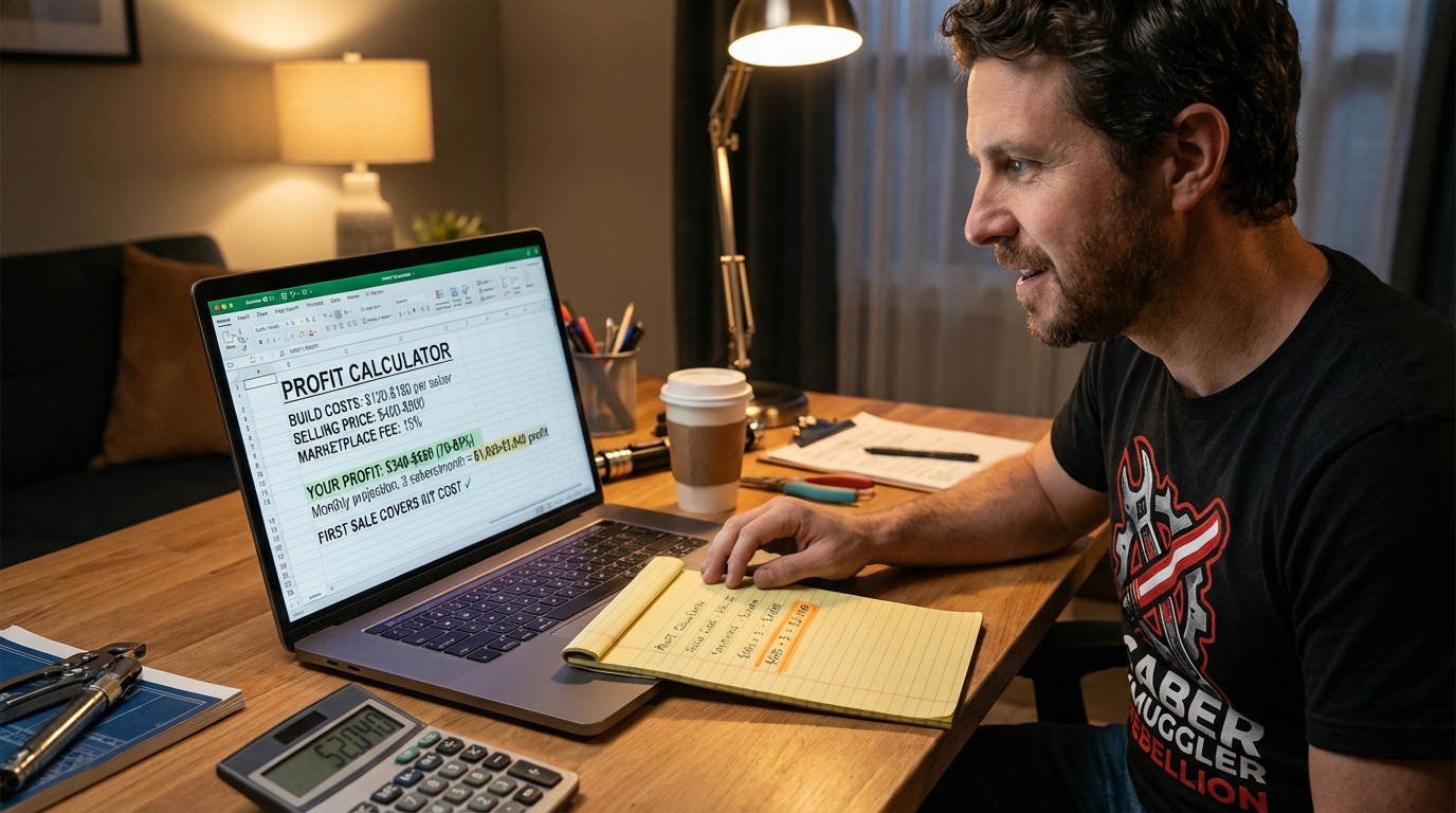 Build cost: $120-$180 per saber. Sell price: $400-$800. First sale covers your monthly kit cost.